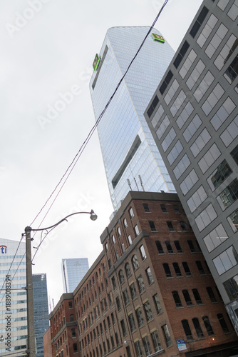 © eugen, Obraz premium architectural textures: old brick building, TD Terrace, and modern office building, looking up on University Av, Toronto