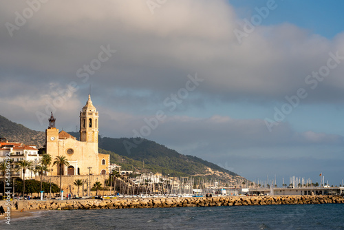 Naklejka premium architecture, bay, beach, beautiful, blue, boat, building, church, city, cityscape, coast, coastline, europe, harbor, island, landmark, landscape, Mediterranean, old, sea, sky, summer, tourism, tower,