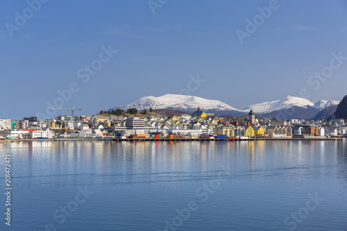 © Patryk Kosmider, Naklejka premium Architecture of Alesund town reflected in the water, Norway