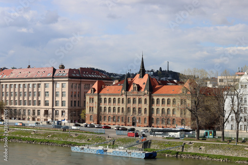 © Maya, Fototapeta premium Architecture of Bratislava, Slovakia. View on old town from Danube river. Cloudy spring day. Panoramic photo of beautiful old buildings. Tourist destinations concept.