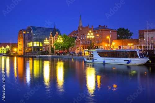 Fototapeta premium Architecture of Bydgoszcz city with reflection in Brda river at night, Poland