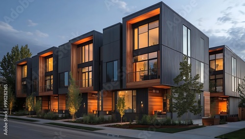 © Shrikant, Naklejka premium Architecture Townhomes with Wood and Black Siding and Pavement Shadows
