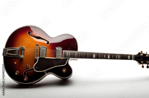 Fototapeta premium Archtop guitar with sunburst finish and elegant curves laying horizontally on a white surface, highlighting its details
