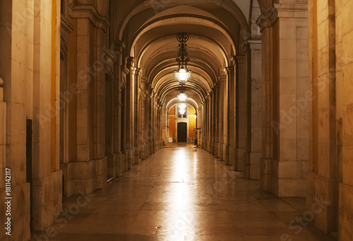© M-Production, Fototapeta premium Archway along Commerce Square in Lisbon at night.