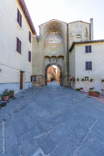 Naklejka premium Archway and fresco painting in Pienza, Tuscany, Italy