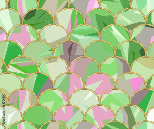 © svrid79, Naklejka premium Arcs seamless pattern. Mosaic, inlay. Illustration in stained glass style. Art Deco style. Seamless chaotic pattern for wallpapers, textile print, tile. Decorative gold waves. Oriental pattern.
