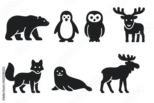 © Jane, Obraz premium Arctic and Antarctic Winter Animal Silhouette Icon Set. Polar Bear, Penguin, Snowy Owl, Reindeer, Arctic Fox, Seal, Moose. Solid Filled Vector Illustrations, Wildlife, Fauna, Isolated on Transparent.