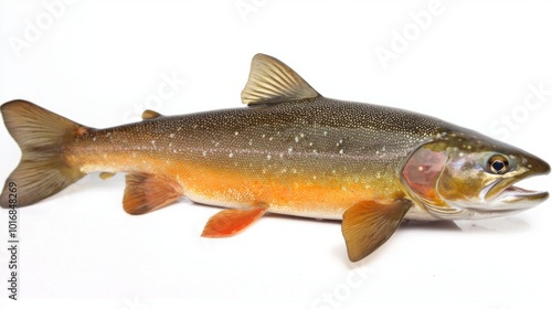 © Vitalii But, Fototapeta premium Arctic Char a unique cold water fish displays its vibrant coloration and fine details against a crisp white background perfect for educational purposes.