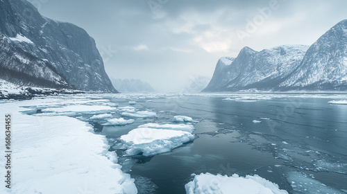 Fototapeta premium Arctic coastal landscape with floating icebergs and icy waters. Cold, serene, and pristine polar environment under soft natural light.