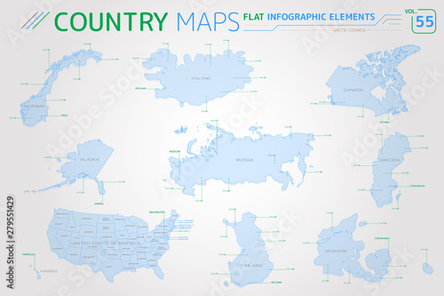 Fototapeta premium Arctic Council, Norway, Iceland, Canada, Denmark, Finland, Russia, Sweden and United States of America Vector Maps