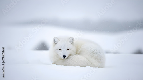 © Leyya, Fototapeta premium Arctic Fox Curled Up Sleeping in the Snow During a Winter Landscape