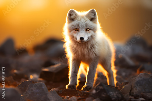 © photosaint, Fototapeta premium Arctic fox exploring rocky terrain during the golden hour in a frozen landscape