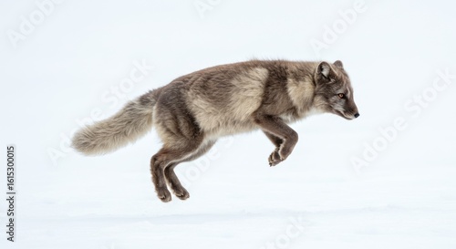 Naklejka premium Arctic fox leaping with agility over the pristine winter landscape backdrop...