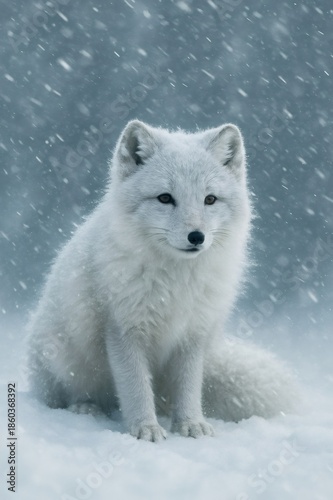 Fototapeta premium Arctic fox looking ahead, sitting on snow during snowfall, showing its white winter fur adapting to cold weather