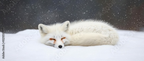 © Adisak, Fototapeta premium Arctic fox sleeping peacefully on a snowy landscape with soft snowflakes falling.