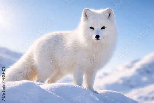 Fototapeta premium Arctic fox standing on snow in bright winter sunlight