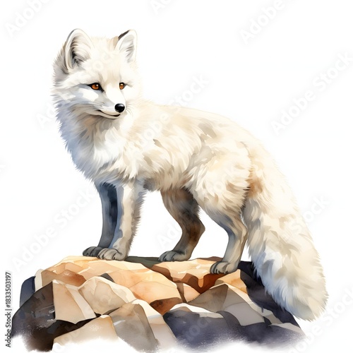 © Studicon, Fototapeta premium Arctic fox stands alert on rocky terrain in a watercolor style painting