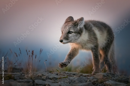 Naklejka premium Arctic fox (Vulpes lagopus) portrait in the sunset