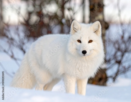 © Erick, Fototapeta premium Arctic fox with thick white fur standing on snow in wintry forest setting