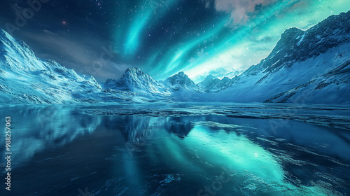 Naklejka premium arctic landscape with northern lights reflection in frozen lake - blue, green, night, mountains, stars