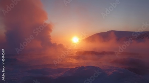 © Aim, Fototapeta premium Arctic Sunset: Geothermal Steam Rises at Dawn