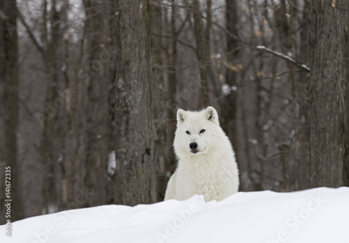 Naklejka premium Arctic wolf (Canis lupus arctos) standing on a snow covered rocky cliff in winter in Canada