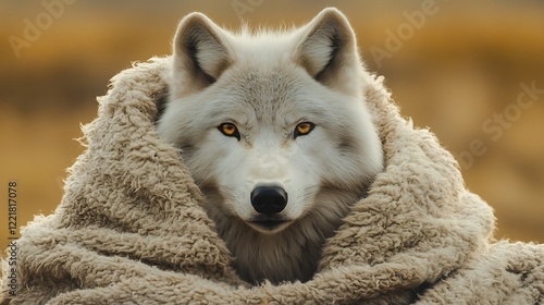 © heinng, Obraz premium Arctic Wolf Cozily Wrapped Warm Golden Light. AI Generated