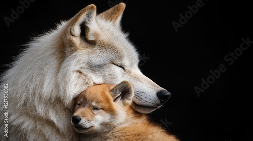 © lulu, Fototapeta premium Arctic wolf cuddling pup, dark studio, nature