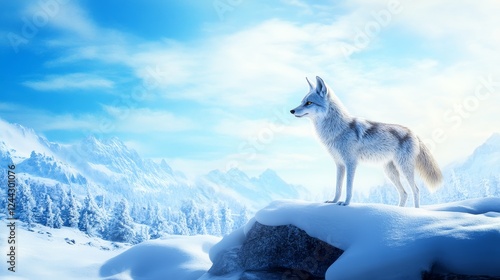 © AI Photo Stock, Obraz premium Arctic Wolf in Winter Wonderland - A majestic white arctic wolf stands proudly on a snow-covered mountain peak, overlooking a breathtaking winter landscape.