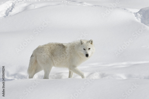 © Jim Cumming, Fototapeta premium Arctic wolf isolated on a white background walking in the winter snow in Canada
