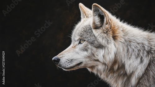 © Chaikit, Fototapeta premium Arctic wolf portrait, piercing pale eyes, detailed white fur texture, black dramatic background, side profile view, studio lighting, wildlife photography, panoramic composition