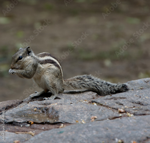 © EMILIA, Naklejka premium Ardilla comiendo en un muro. Funambulus roedor esciuromorfo Sciuridae, ardilla de las palmeras, India, copy-space