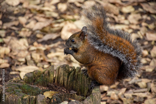 © Diana, Obraz premium Ardilla silvestre color café comiendo cacahuates, en su hábitat natural dentro del bosque sobre un tronco
