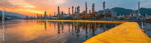 © Jiraporn, Fototapeta premium Area closure using chemical spill barrier concept. Industrial landscape with sunset reflection on calm waters.