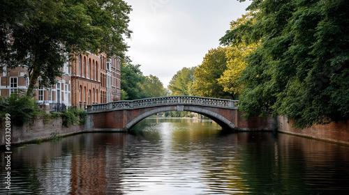 © Kateryna Arkhypova, Fototapeta premium Aredbrickbridgeoveracanallightedbysoftillumination