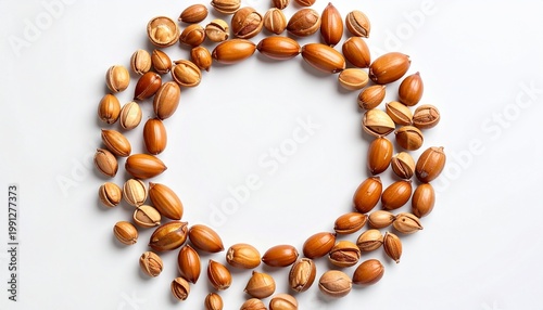 Obraz premium Argan seeds form a circular composition with empty space in the center, white background, minimalist design.
