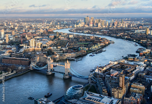 © Csaba Peterdi, Fototapeta premium Arial widok Londynu z Tamizą i Tower Bridge o zachodzie słońca