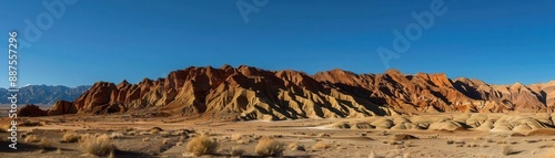 © Yotwarit, Naklejka premium Arid desert landscape with eroded rock formations under a blue sky with clouds.