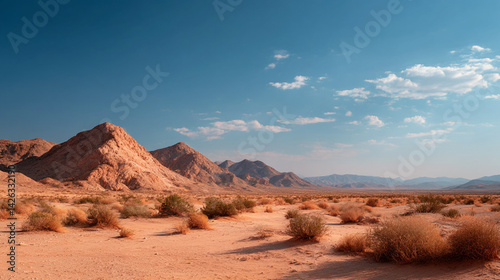 Naklejka premium Arid landscape featuring mountains under a clear blue sky with scattered clouds and desert vegetation