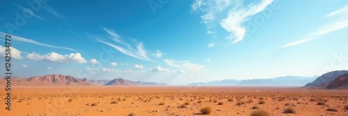 Fototapeta premium Arid terrain stretches far and wide under radiant blue skies with wispy clouds scattered across the horizon, desert landscape, dry ground
