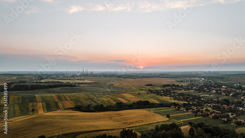 Fototapeta premium Ariel shot of sunset and beautiful fields