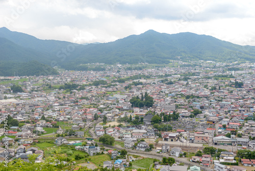 © GypsyGraphy, Fototapeta premium Ariel view of small town with mountain in background, Shimoyoshida in Yamanashi, Japan.