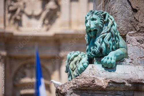 Fototapeta premium Arles France July 12th 2015 : Bronze lions on the 'Needle of Arles' obelisk...