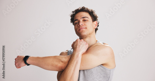 Fototapeta premium Arm, exercise and portrait of man stretching on studio space for start of...