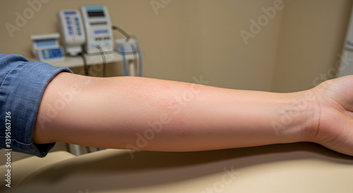 Fototapeta premium Arm in medical setting, skin texture close-up, clinical background.
