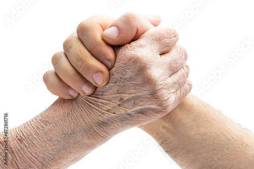 Fototapeta premium Arm wrestling concept of old hand vs young isolated on white