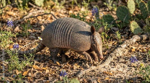 Obraz premium Armadillo foraging in a Texas habitat with wildflowers.