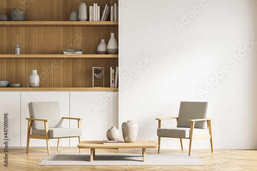 Fototapeta premium Armchairs near light beige living room wall with bookcase