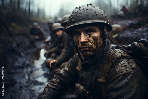 © Impact AI, Obraz premium Armed soldiers in muddy trenches