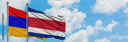 Naklejka premium Armenia and Costa Rica flag waving in the wind against white cloudy blue sky...